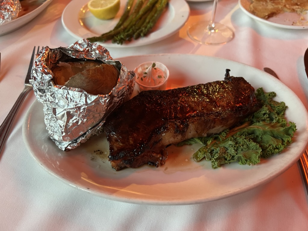 This is the kind of place where the servers have worked here for decades and wear the white jackets you might expect from a higher-end, classy establishment. There’s a section of the restaurant that looks like they put a roof over the former outdoor patio, and we sat there for the evening as our friendly server brought us both delicious food and great energy. You really can’t go wrong with any cut of meat or sides here, and topping it off with a solid red wine makes the evening a fun one.